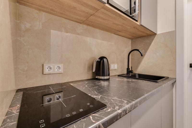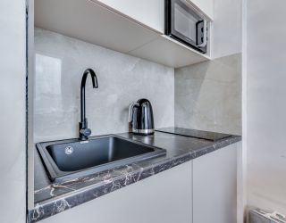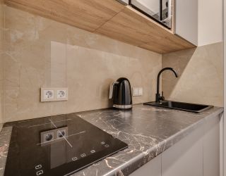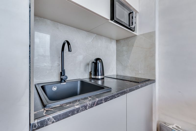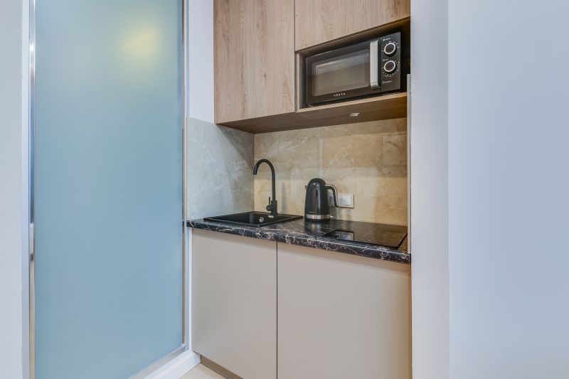 - кухня (раковина, индукционная плита, электрический чайник, холодильник, посуда)